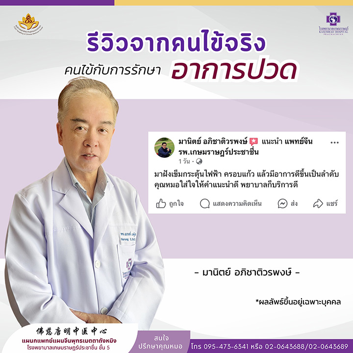 "มาฝังเข็มกระตุ้นไฟฟ้า ครอบแก้ว แล้วมีอาการดีขึ้นเป็นลำดับ คุณหมอใส่ใจให้คำแนะนำดี...