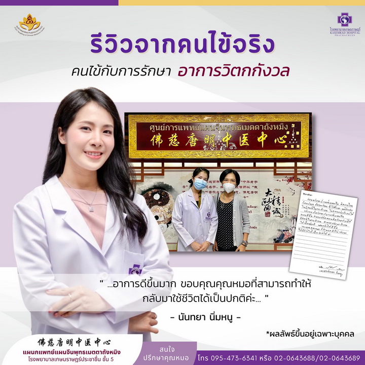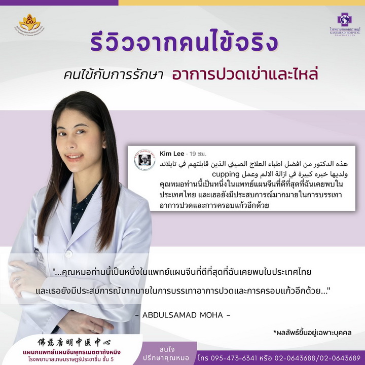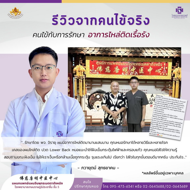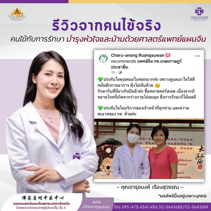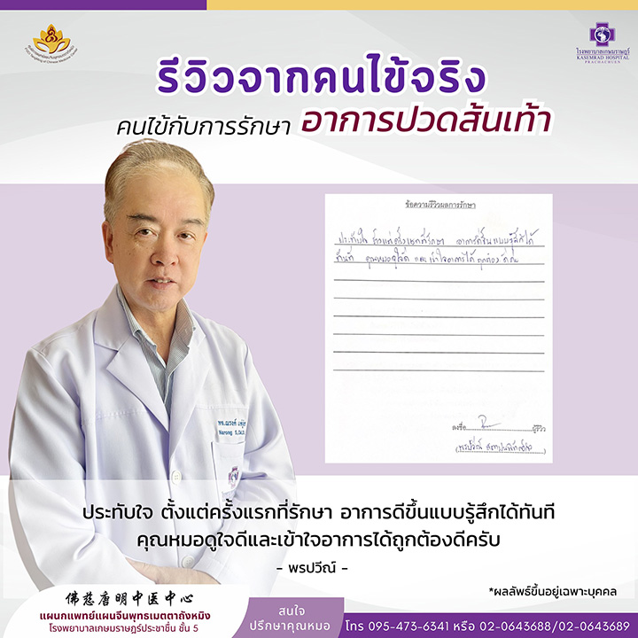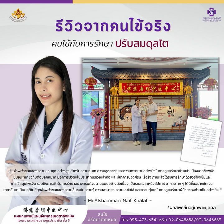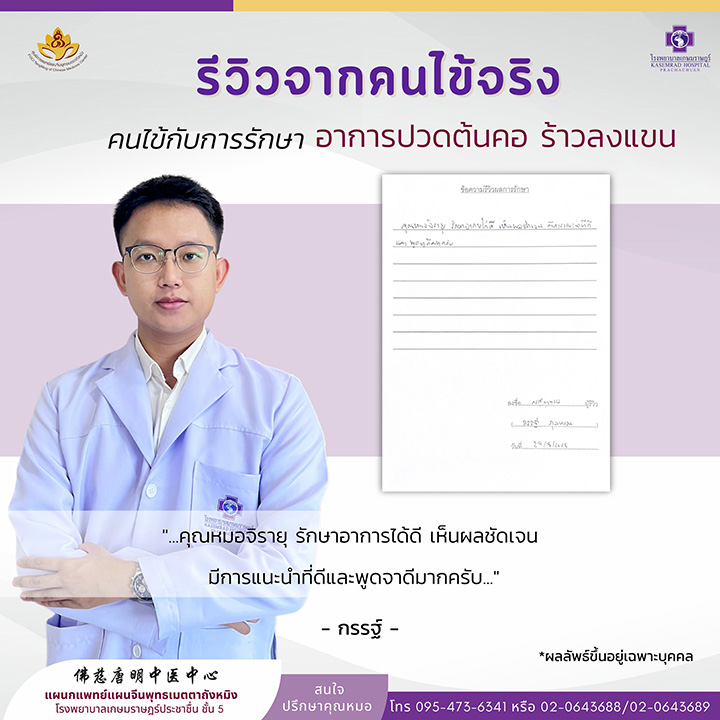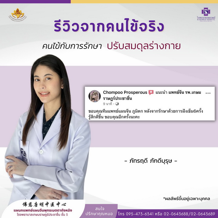 "ขอบคุณทีมแพทย์แผนจีน ภูมิตก หลังจากรักษาด้วยการฝังเข็ม 6 ครั้ง รู้สึกดีขึ้น ขอบคุณอีกครั้งนะคะ" - ภัทรฤดี ภักดีบุรุษ -