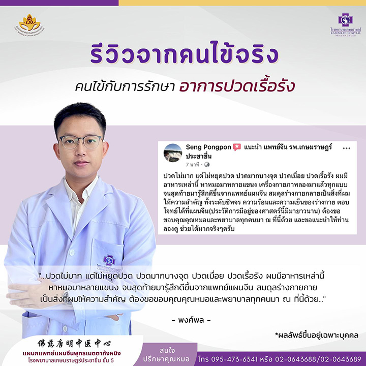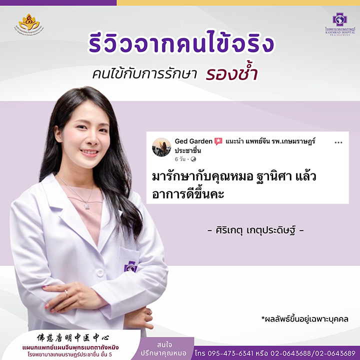 รพ.เกษมราษฏร์ มีความเพียบพร้อมด้วยบุคคลากรทางการแพทย์ และสมุนไพรจีนพร้อมดูแลผู้ป่วยระยะแรกเริ่มจนถึงโรคเรื้อรังด้วยศาสตร์การแพทย์แผนจีน อาทิ เช่น ฝังเข็ม ครอบแก้ว นวดทุยหนา กวาซา สมุนไพรจีน โดยแพทย์จะเลือกใช้วิธีรักษาตามความเหมาะสมของโรค ไม่เพียงแต่ให้แค่การรักษาเท่านั้น เรายังเน้นให้ผู้ป่วยปรับพฤติกรรมการใช้ชีวิตเพื่อช่วยเพิ่มประสิทธิภาพของผลการรักษาให้ดียิ่งขึ้น