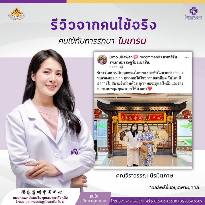 "...รักษาไมเกรนกับคุณหมอใบหยก ประทับใจมากค่ะ อาการทุเลาลงเยอะมาก คุณหมอใส่ใจทุกรายละเอียด...