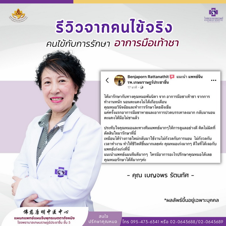 “...ดิฉันได้รีบการรักษาอาการปลายประสาทนิ้วมือและฝ่ามือชา ซึ่งรักษามาหลายครั้งต่อเนื่อง 2 ปี...