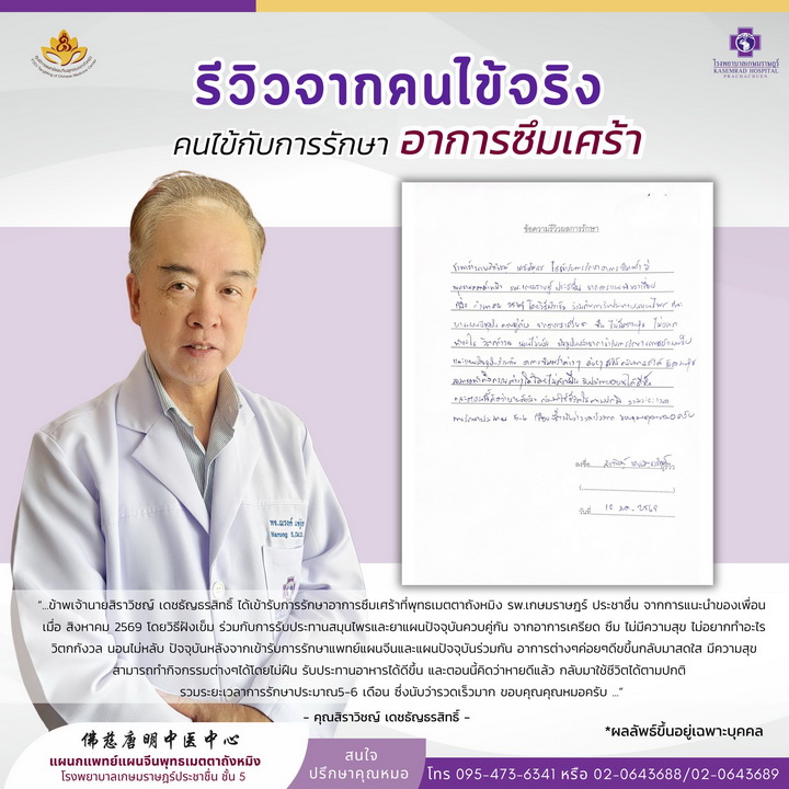 “...ข้าพเจ้านายสิราวิชญ์ เดชธัญธรสิทธิ์ ได้เข้ารับการรักษาอาการซึมเศร้าที่พุทธเมตตาถังหมิง...