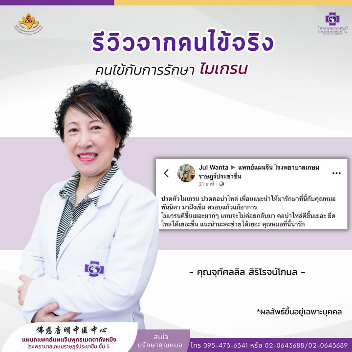 "มารักษาอาการปวดหัว ไมเกรน มีการอาการปวดมาก ปวดทั้งวันทั้งคืนและได้มารักษาฝังเข็มกับคุณหมอพันนิดา...