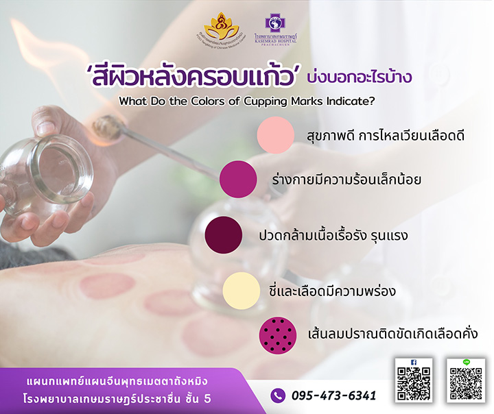สีของผิวหนังหลังการครอบแก้วสามารถสะท้อนถึงสภาพร่างกายภายในได้อย่างหลากหลาย โดยทั่วไปแล้ว สีที่ปรากฏหลังการครอบแก้วจะขึ้นอยู่กับระดับของการไหลเวียนโลหิต การติดขัดของพลังชี่ (Qi) และภาวะเลือดคั่งในบริเวณนั้น